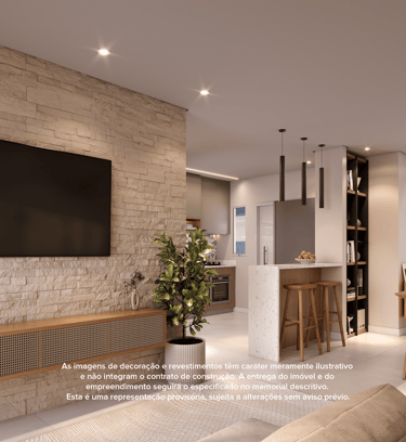 Living com sala, cozinha e varanda gourmet integrados